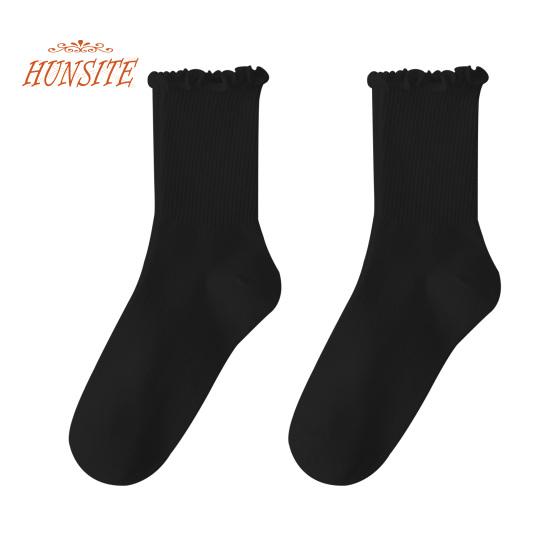 1 пара женских носков средней длины с рюшами, гофрированные края, полосатая текстура, высокая эластичность, противоскользящие, дышащие чёрный