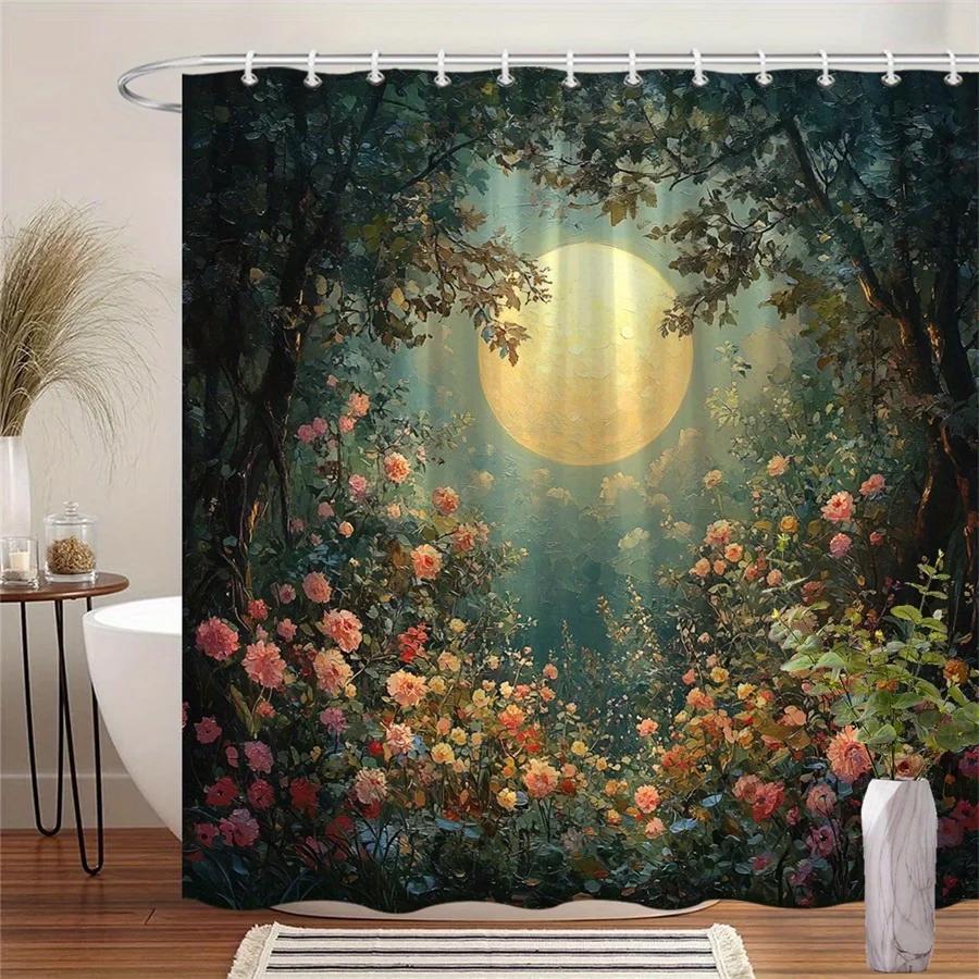 1 шт. Импрессионистская душевая штора «Цветы лунного сада» - Яркие розовые и персиковые розы и ночная сцена с полной луной, Мягкий мазок кистью Дес W90xH180cm