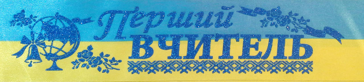 Перший вчитель - стрічка атлас, глітер без обводки (укр.мова) ЖБ, Синий, Украинский