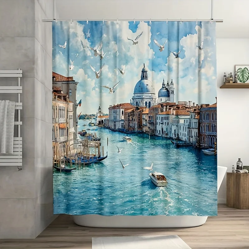 1 шт., занавеска для душа с принтом Венеции Гранд Канала, прочное полиэфирное волокно, можно стирать в машине с крючками, для декора ванной комнаты и ванны