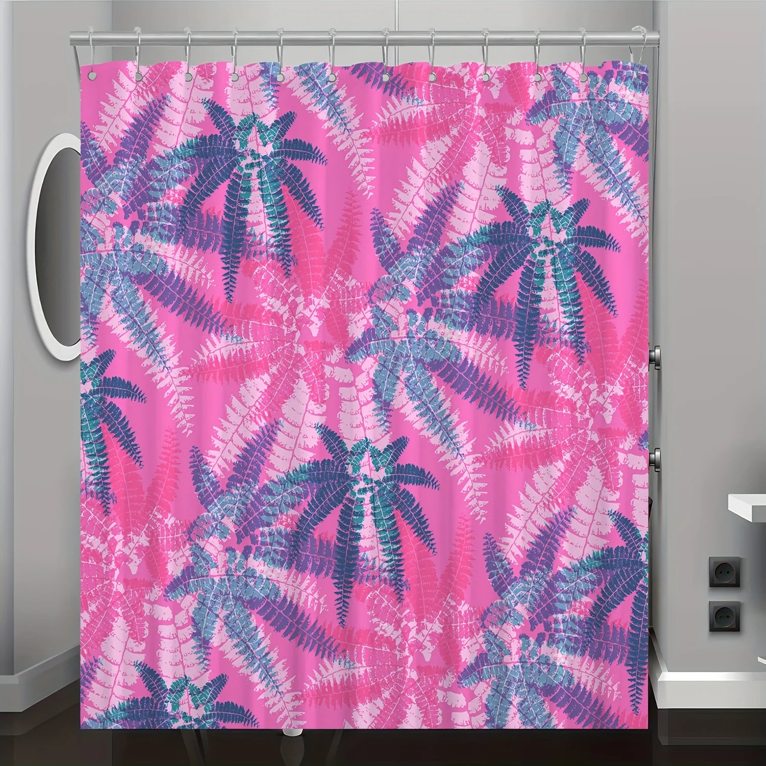 1 шт. занавеска для душа с принтом тропических пальмовых листьев, розовая с синими и зелеными акцентами, в комплект входят крючки, можно стирать в машине, прочный полиэстер