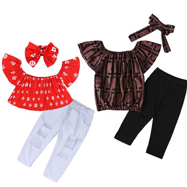 kids clothes set bow hairband a word shoulder hole pant 3 pcs set kids designer clothes girls baby girl 2 styles ba33, White