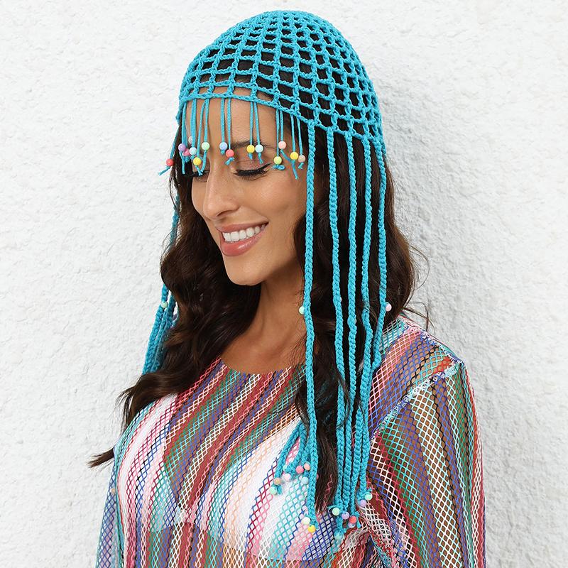 1 шт. однотонная вязаная шапка в стиле бохо, модный ажурный пуловер, головной убор с бусинами и кисточками, ручная работа, вязаная крючком шапка-бини