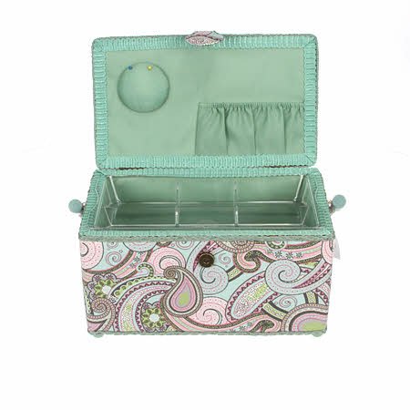 Sewing Basket Sewing Box Seafoam Blue. Mint Green and Pink Groovy Paisley Print Fabric Hobby Box Trimed in Lovely Green ~ Medium Rectangle ~ 11" X 6" X 6.5" (28cm x 15cm x 16.5cm) with Handle, Magnetic Snap Clasp and Feet