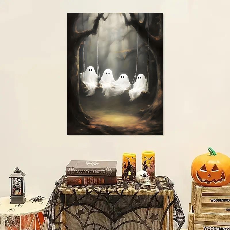 1 шт. с рамой Четыре милых привидения Веселая креативная холстовая картина Дом Гостиная Ванная комната Отель Кофейня Офис Хэллоуин Искусство Холст Настенное искусство Постер 20*30cm(with frame)