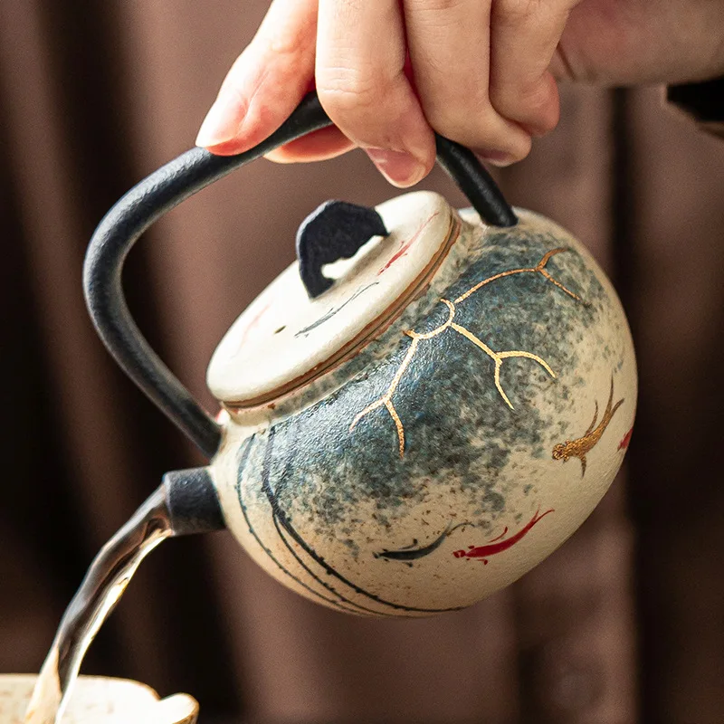 Blue and White Flint Red Teapot Decoration Hand Painted Charm of Koi Loop-Handled Ceramic Tea Set with Filter