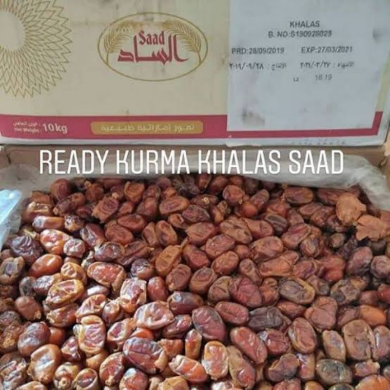 Kurma Khalas As Saad adalah kurma curah yang berasal dari Emirate. Rasanya gurih dengan rasa manis yang khas, empuk bila digigit. Sebagian orang menganggap kurma ini mirip dengan manisnya madu. Kurma ini dikenal di seluruh dunia sebagai kurma kualitas premium namun harga sangat terjangkau sehingga jadi kurma favorit dan best seller tiap tahun.