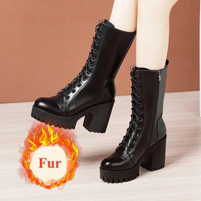 10см Маленький размер 32-43 Осень Зима Натуральная кожа Ботинки Обувь на платформе 2025 Женские Ботильоны до середины икры на высоком блочном каблуке Офисная модель 39