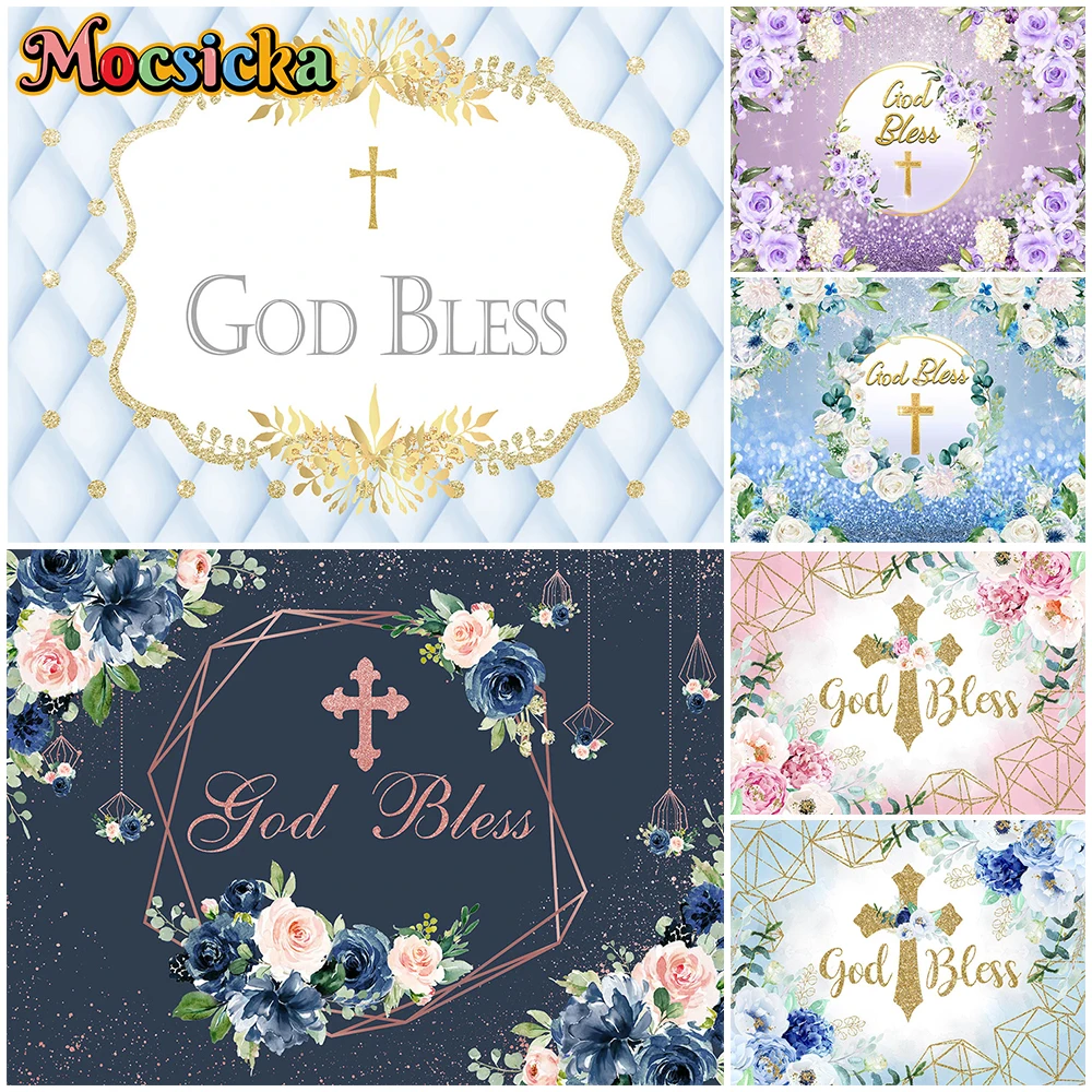 Mocsicka Boy Girl Communion God Bless Backdrop Christening Favor Baptism Decorstion Baby Shower Photography Background Photocall