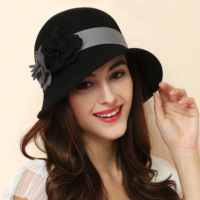 100% австралийская черная шерстяная фетровая шляпа-федора для женщин, винтажная Зимняя шляпа с широкими полями церковный колокол Дерби, шляп...
