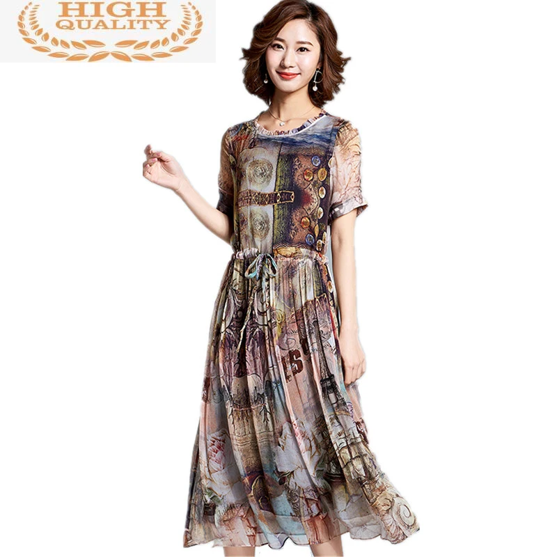 100% 2021 натурального шелка платье для женщин, для весны и лета, Ретро стиль, с принтом Длинные платья натуральная шелковая ткань из гофрирован...