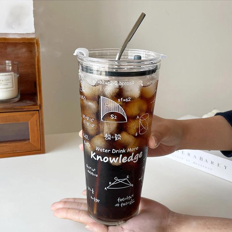 1000 мл Большая емкость Математический узор Прозрачная стеклянная чашка Посуда Чашка с крышкой и соломкой из нержавеющей стали Молоко Сок Кофе Кружка 1000ml