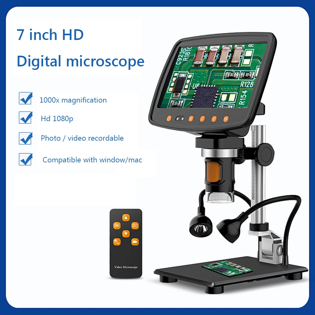 1000X LED Digital Microscope 7" HD Display Video Microscope Clock Repair Skin Detect Industrial Microscope w/ Metal Lifting Base