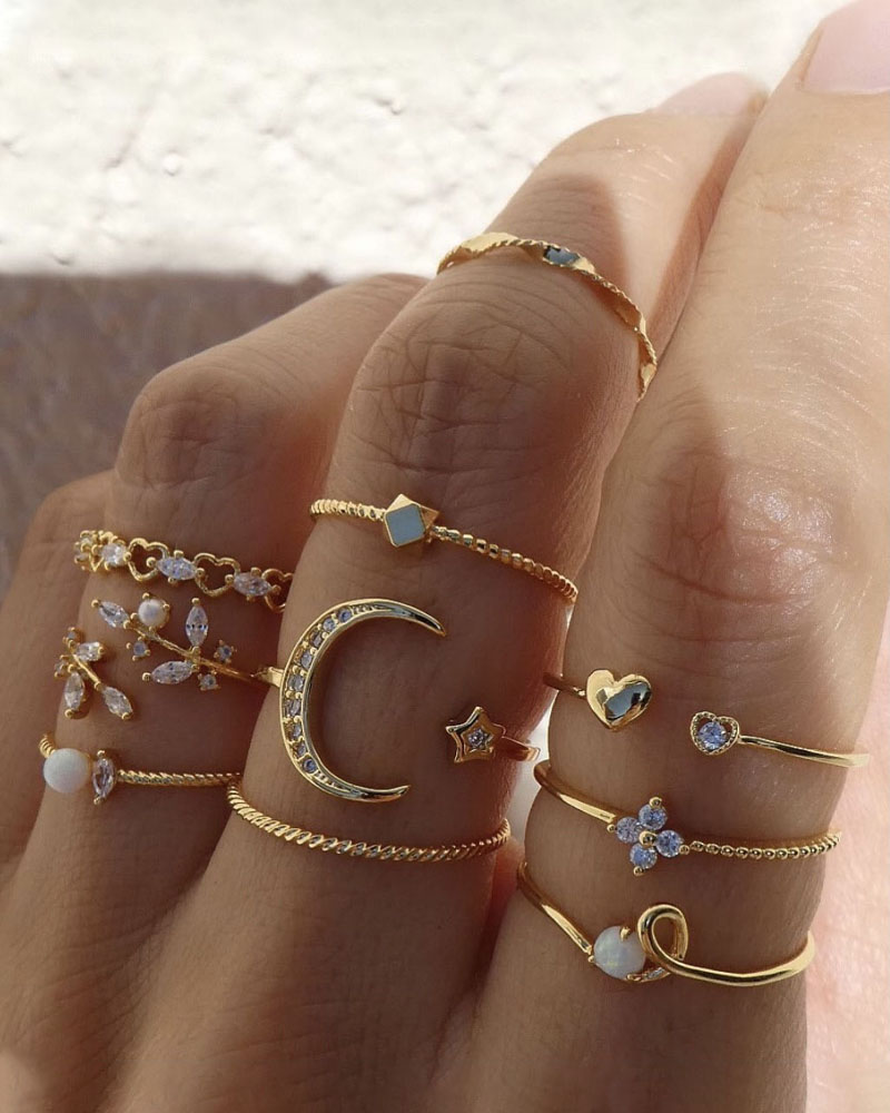 10PCS/Set Rhinestone Pearls Decor Star Moon Geo Pattern Boho Ring, Gold