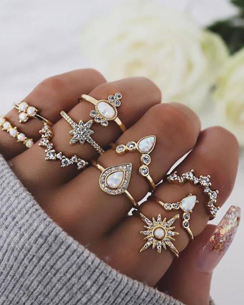 10PCS Waterdrop & Sun Pattern Opan Rhinestone Decor Rings Set, Silver