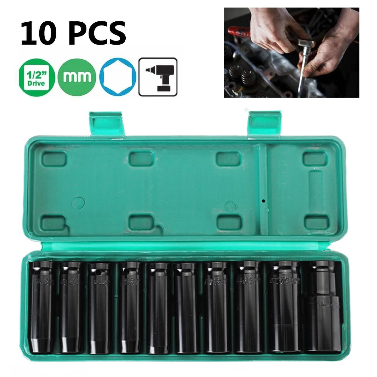 10pcs 1/2 Inch Drive Deep Air Impact Socket Set Wrench Adapter Drive Socket Converter Reducer