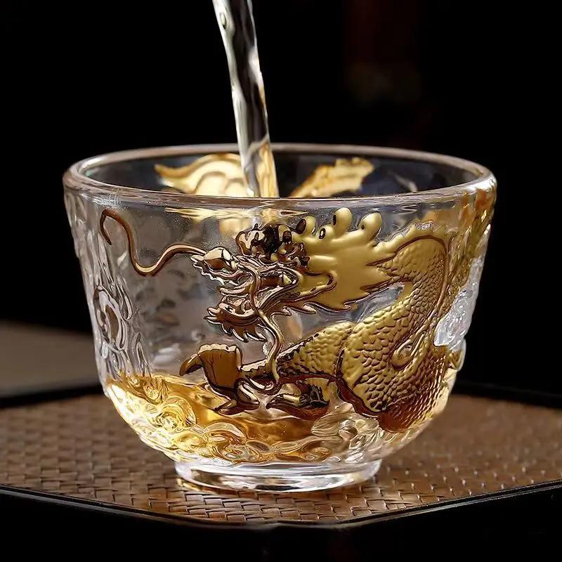 110 мл Китайская чашка для чая Золотой Дракон Благоприятное Облако Расписанная золотом Мастер-чашка Кристально Прозрачное Стекло Дзен Кунг-фу Чайная Пиала 101-200ml