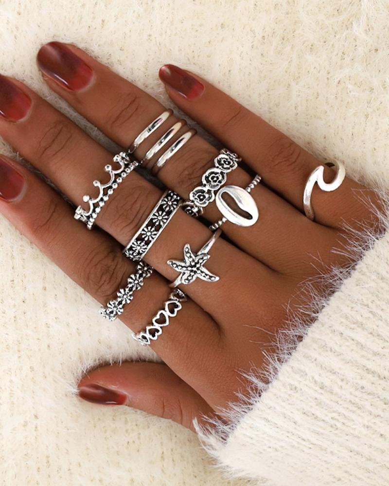 11PCS Heart Star Floral Pattern Rings Set, Silver