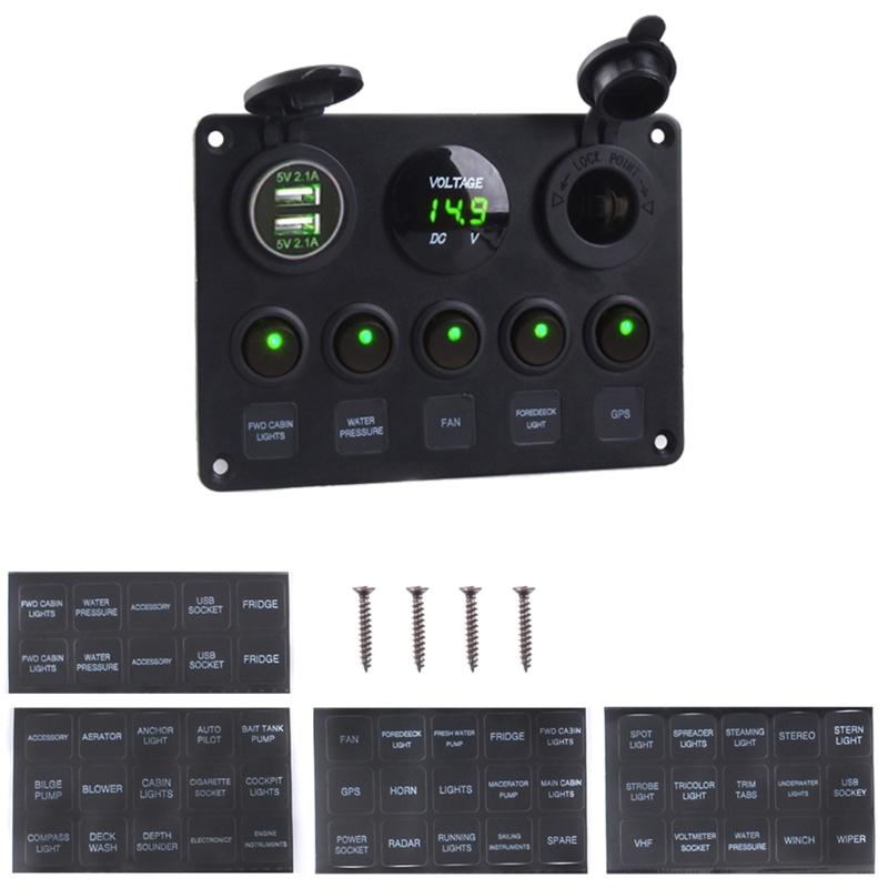 12 В 24 В 5-кнопочная светодиодная панель с переключателем USB для автомобиля, морской лодки, грузовика, прицепа, каравана, аксессуаров зеленый свет