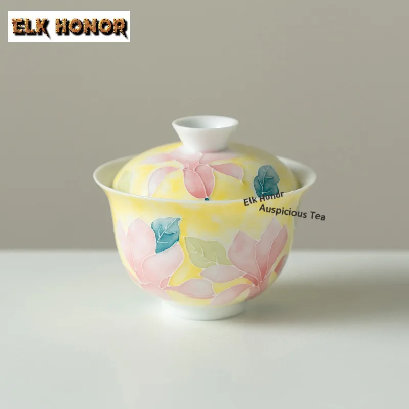 120 мл ручная роспись желтый Mistjade Magnolia Gaiwan традиционная чайная вареньонная чайная чаша с крышкой комплект чайник крышка чаша предмети чая