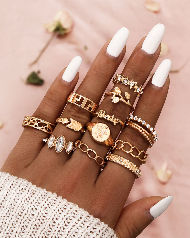 12PCS/Set Rhinestone Decor Geo Star Floral Pattern Ring, Gold