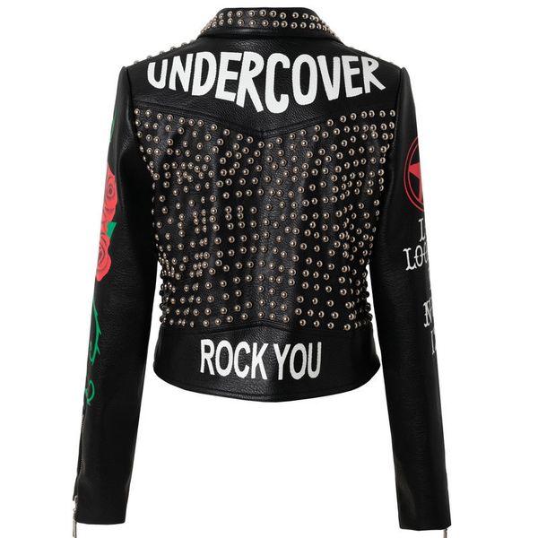 women's spring and autumn new street motorcycle punk style flower print tiger head heavy industry rivet short leather jacket, Black