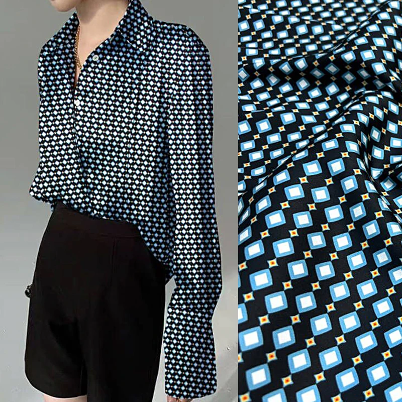 140 см приблизительно Толстая-синяя ромбовидная печатная саржевая шелковая ткань для летней рубашки брюк платье-тянущаяся Удобная Шелковая ткань D1635