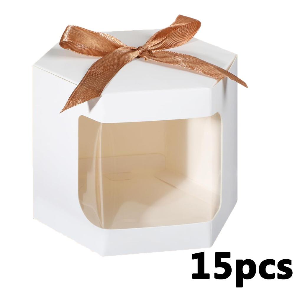 15 шт. Белые подарочные коробки с прозрачным окном, шестиугольные коробки для угощений с крышкой и лентой, подарочная упаковочная коробка для мыла, пасхальных свадебных вечеринок, ювелирных изделий 15pcs 7x7x7cm