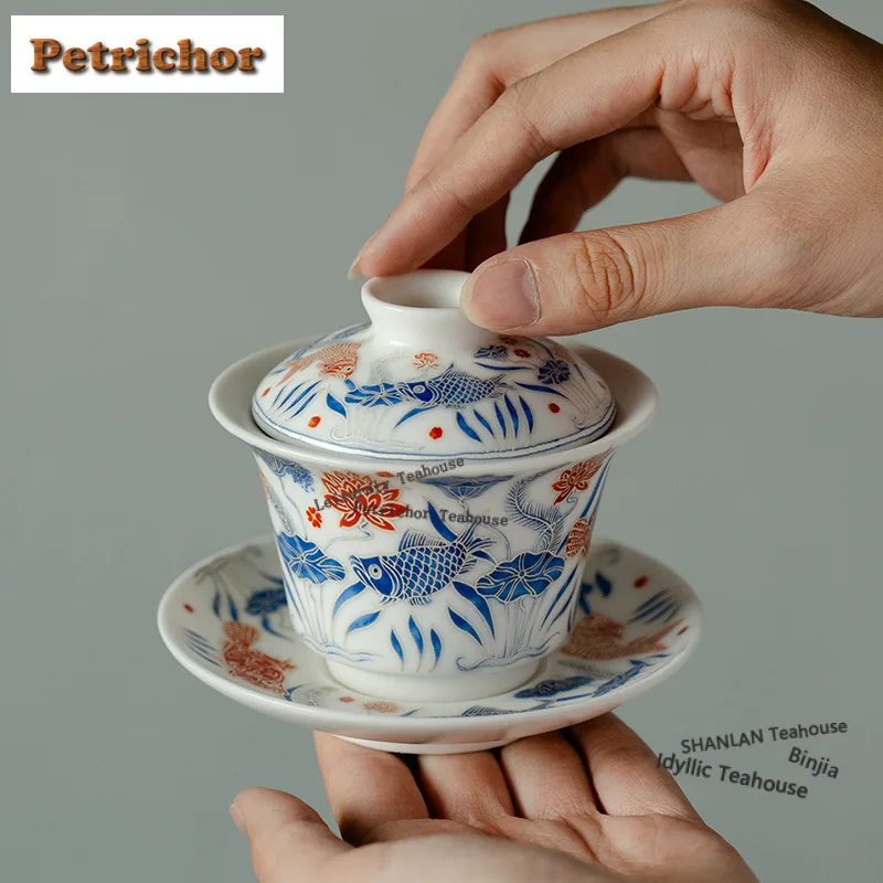 150 мл сине-белая подглазурная красная жевательная древняя чайная варенька, чайная чаша с крышкой, комплект чайника, крышка, миска, коллекция посуды для напитков