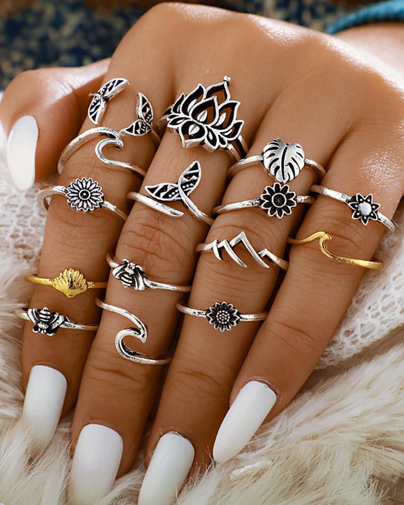 15PCS Leaf & Floral Charm Rings Set, Silver