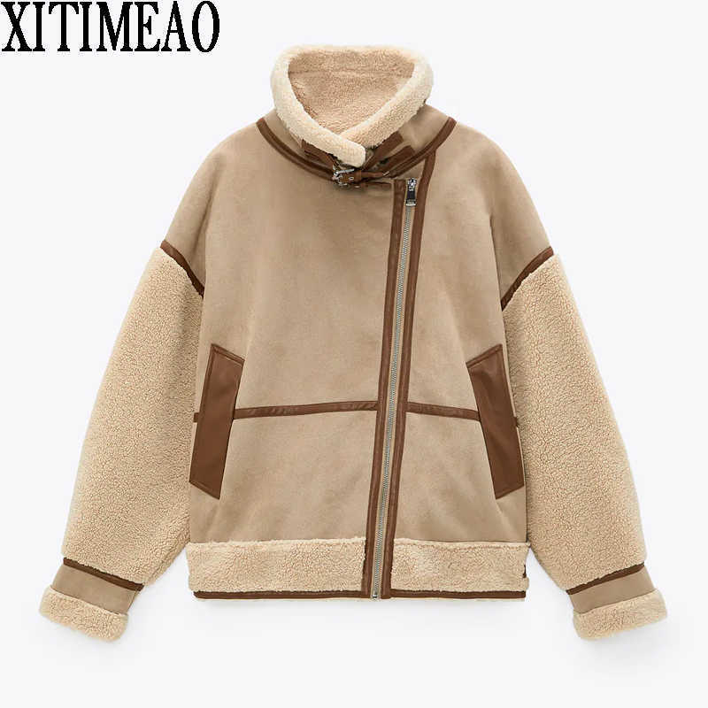 ZA Women Winter Lambskin Jacket Coat Casual Fashion Lamb Faux Fur Overcoat Fluffy Loose Oversized Thicken Warm Outerwear 210602, Khaki