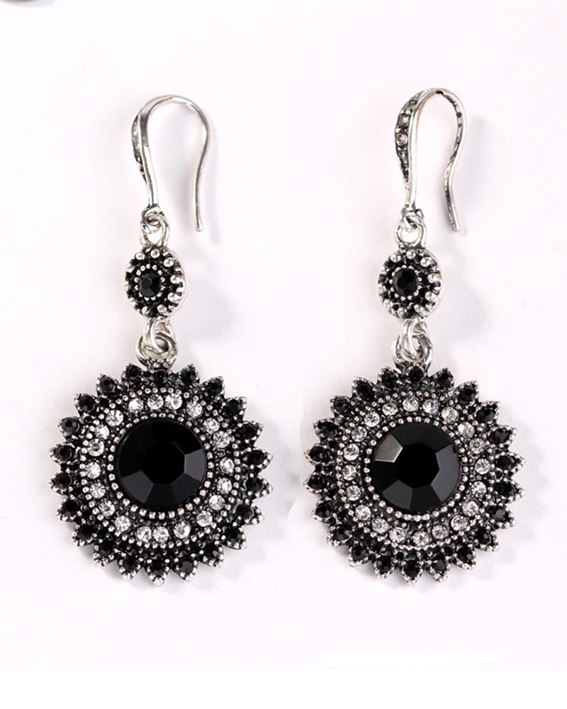 1Pair Clan Retro Sunflower Pattern Rhinestone Hoop Earrings, Black