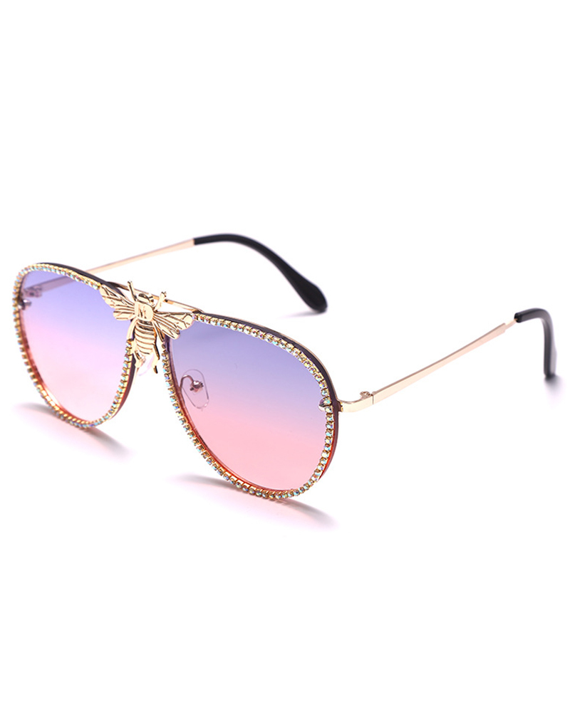 1Pair Gradient Rhinestone Bee Pattern Trendy Pilot Sunglasses, Style4