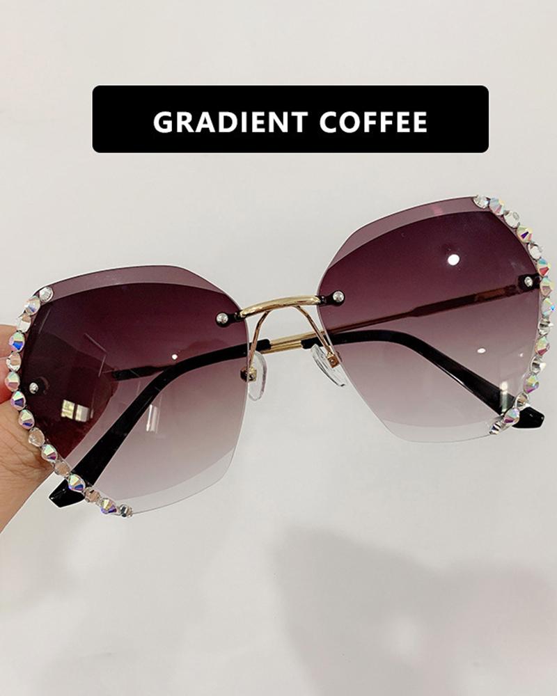 1Pair Ombre Rimless Rhinestone Geometric Metal Frame Sunglasses, Coffee