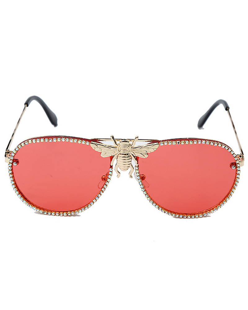 1Pair Rhinestone Bee Pattern Trendy Pilot Sunglasses, Red