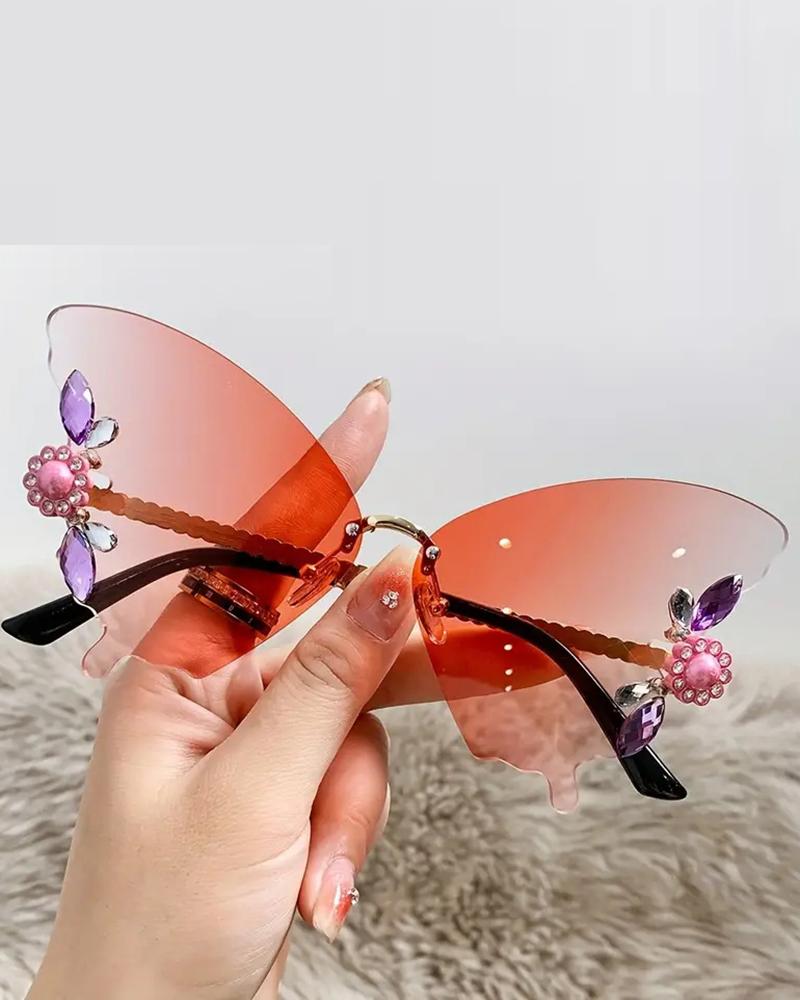 1Pair Rhinestone Butterfly Shaped Rimless Sunglasses, Pink