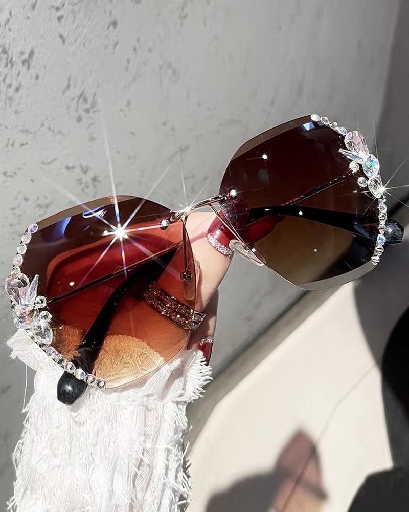 1Pair Rhinestone Tinted Lens Irregular Rimless Frame Sunglasses, Orange