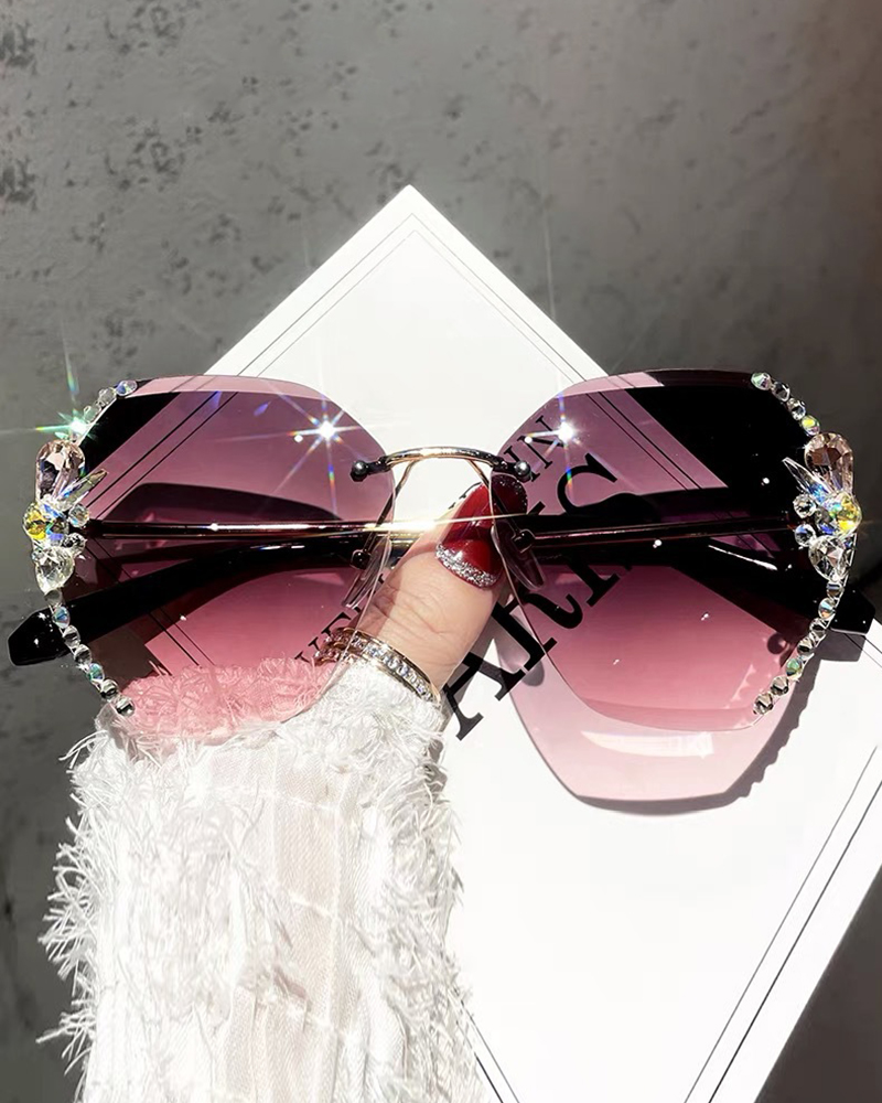 1Pair Rhinestone Tinted Lens Irregular Rimless Frame Sunglasses, Purple