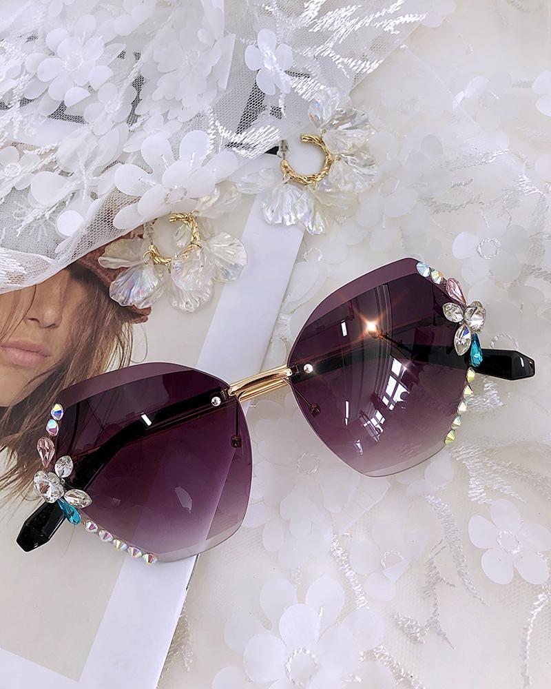 1Pair Rimless Rhinestone Decor Studded Sunglasses, Tan