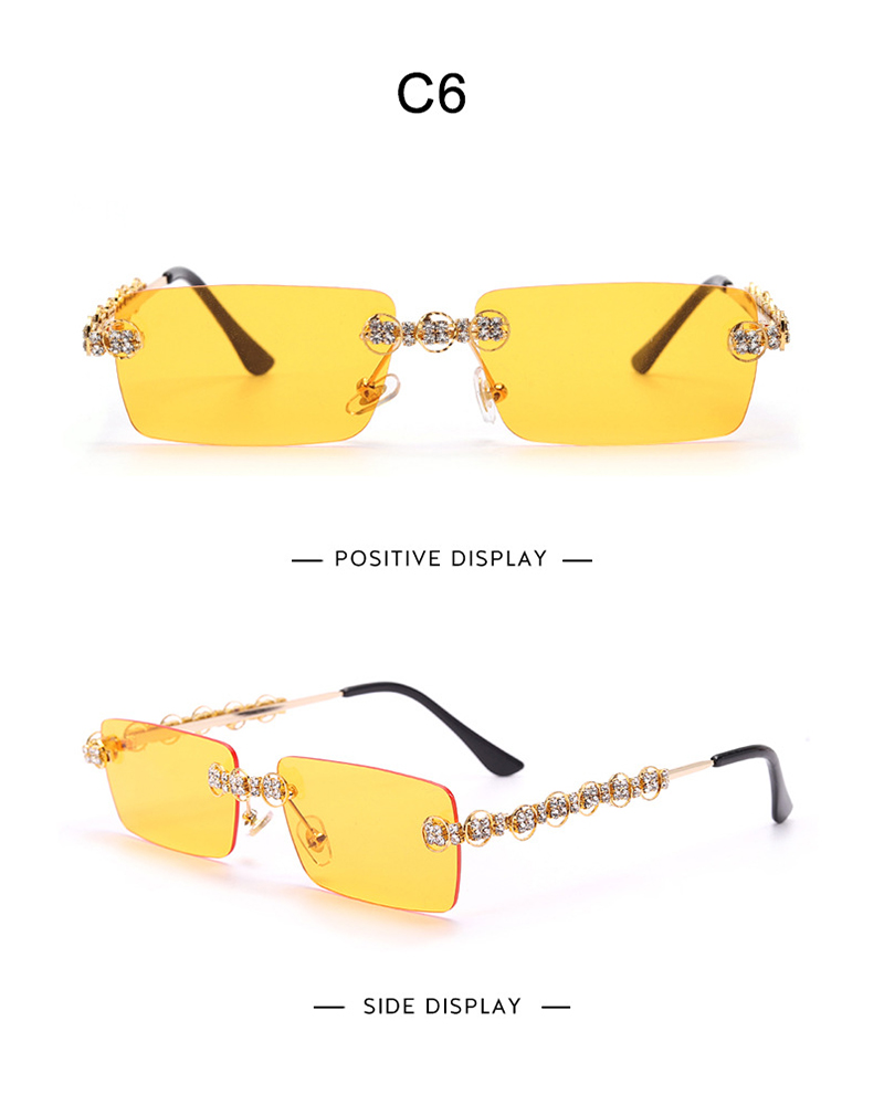 1Pair Rimless Rhinestone Rectangle Tinted Lens Sunglasses, Yellow