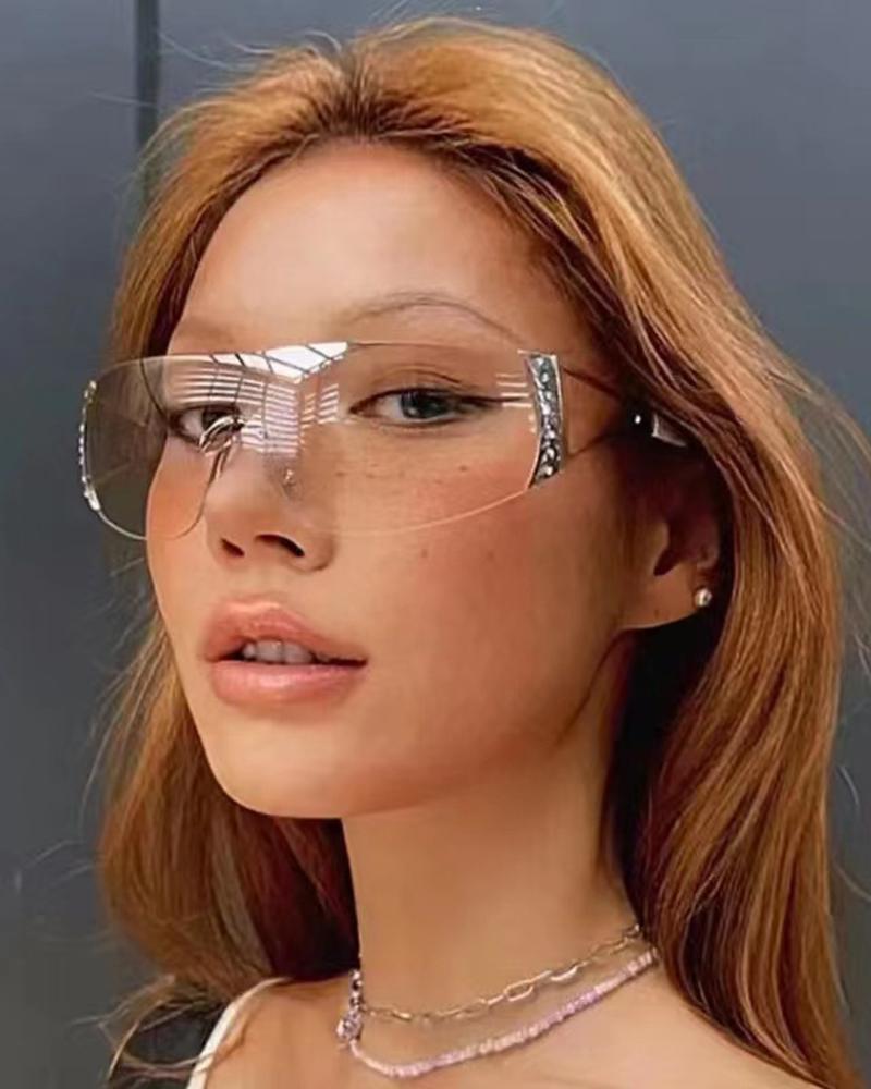 1Pair Rimless Rhinestone Tinted Shield Sunglasses, Style4