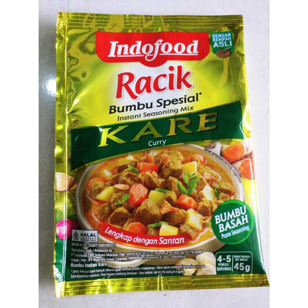 Indofood Racik Kare: Bumbu ini sudah diracik dengan bahan-bahan seperti santan, rempah-rempah, bawang merah, bawang putih, dan lain-lain, sehingga menghasilkan rasa kari yang otentik.