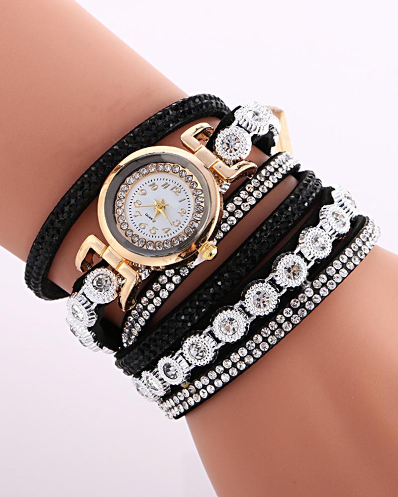 1pc Allover Rhinestone Stackable Bangle Quartz Watch, Black