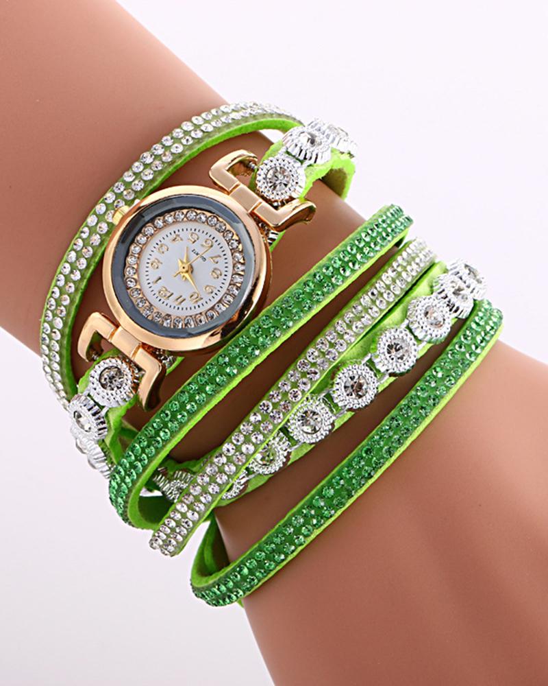 1pc Allover Rhinestone Stackable Bangle Quartz Watch, Green