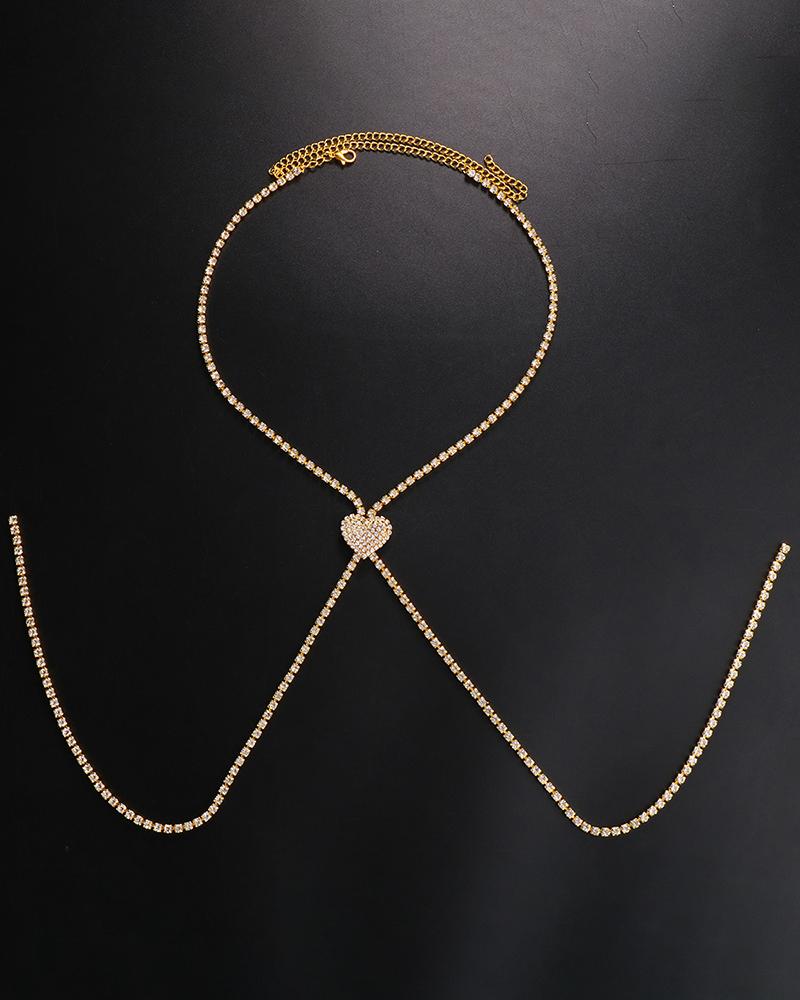 1pc Full Rhinestone Heart Pattern Tassel Chain Necklace, Gold