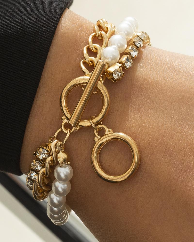 1pc Multi-layer Rhinestone Beaded OT Toggle Chain Bracelet, Gold