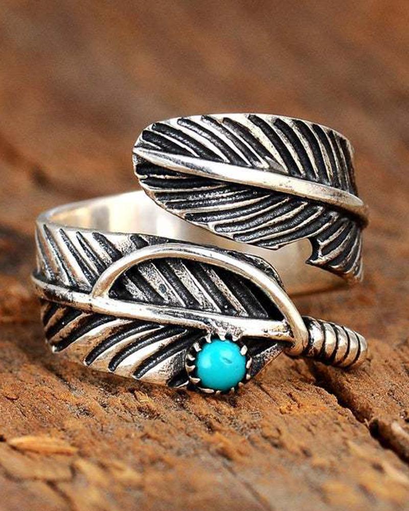 1pc Retro Turquoise Feather Shaped Opening Ring, Silver