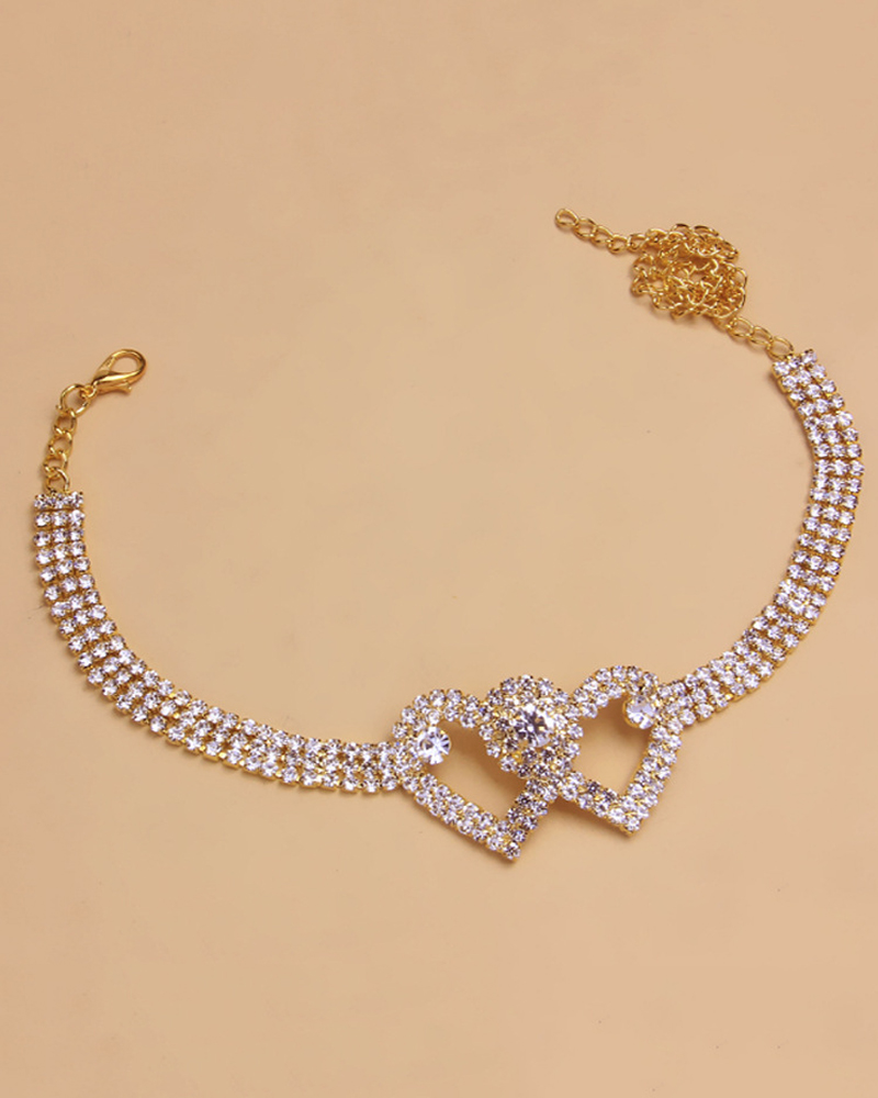1pc Rhinestone Chain Double Heart Anklet, Gold