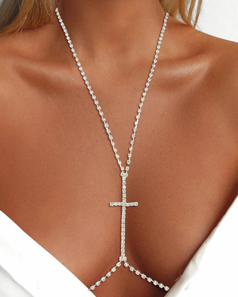 1pc Rhinestone Cross Pattern Halter Bra Body Chain, Silver