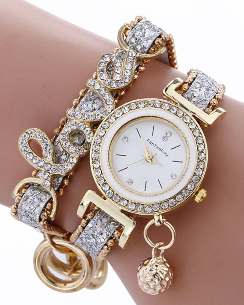 1pc Rhinestone Decor Lover Letter Pattern Bangle Quartz Watch, White